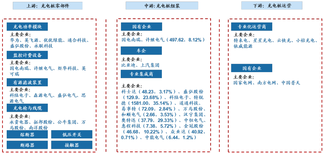 充电桩产业链上游是零部件制造环节,中游为充电桩组装环节,下游则是运营环节。充电桩充电电压越高,功率越大,其对制造技术和建设运维的要求就越高。