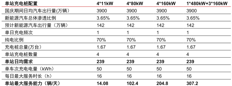 以新能源车主最担忧的节假日高速场景为例,大功率快充所体现的优势将更为直观。按照中信证券测算结果,对于同样配备4个充电桩的充电站,配备1*480kW+3*160kW的大功率充电桩可以在土地占用基本不变的前提下,日均服务能力从4*11kW交流桩的14辆提升至307辆,两者能力高下立判。