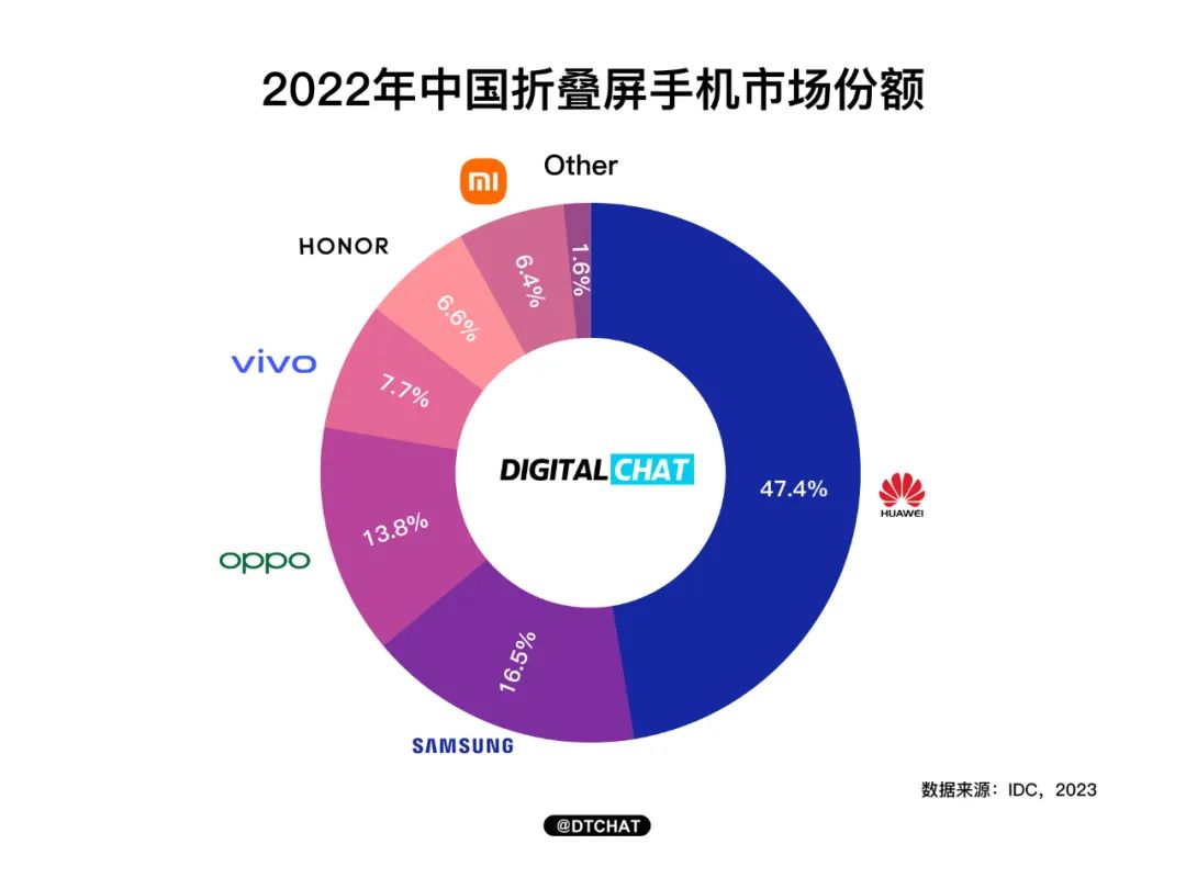 但行业第一人不见得就是市场份额最多的那个,这种先发优势很快被我国手机厂商超越。透过IDC这张图片可以看到,华为在全球市场上占比最高,甚至接近三星的三倍。2022年,华为在折叠屏手机侧发力足够猛烈。