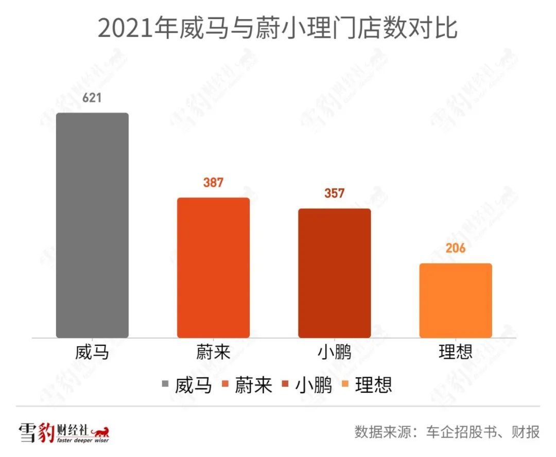这一招让威马门店数井喷。截至2021年年底,威马汽车有621家合作伙伴门店,而同期蔚小理门店数量分别为387、357和206家。