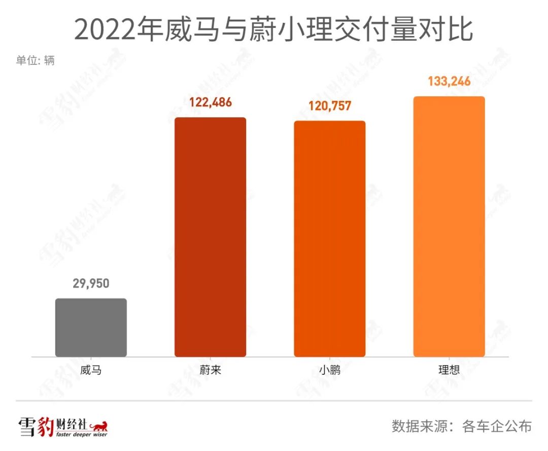 但即使在那个时间点,威马掉队的说法也已开始甚嚣尘上。2020年,威马一年卖出2.25万辆新车,下滑至造车新势力第四位。一位威马门店员工告诉雪豹财经社,这个数字还包含了不少网约车的销量。