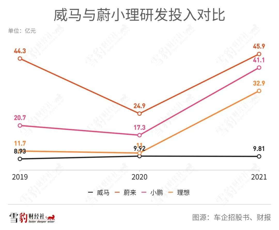沈晖一度在对外宣传时将智能化作为威马的标签之一,但从研发投入上很难看出威马的决心。2019-2021年,威马研发投入总计28.66亿元。相比之下,2021年一年,蔚来、小鹏、理想的研发投入分别为45.9亿、41.1亿和32.9亿元。