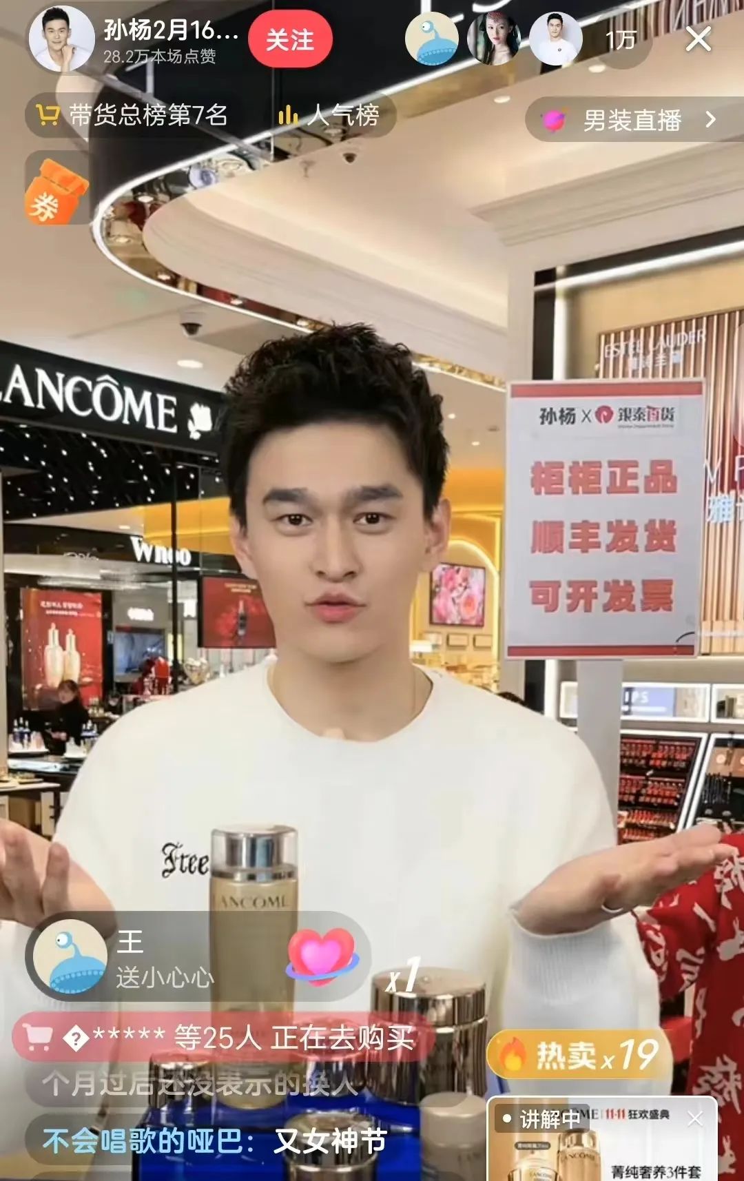 2022年1月14日当天上午十一点,孙杨在抖音开启了直播首秀,地点是海南三亚的海旅免税城。首次直播带货,孙杨的选品就集中在了海蓝之谜、雅诗兰黛在内的各大美妆品牌。开播没有多久,孙杨直播间就涌入了四万人,不到半小时直接冲到带货榜首。