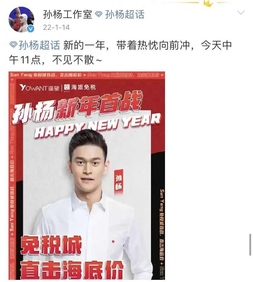 当时孙杨刚刚对外发布直播预告,在因为被禁赛而无法进入赛场后,直播带货显然成了孙杨接下来的新挑战。