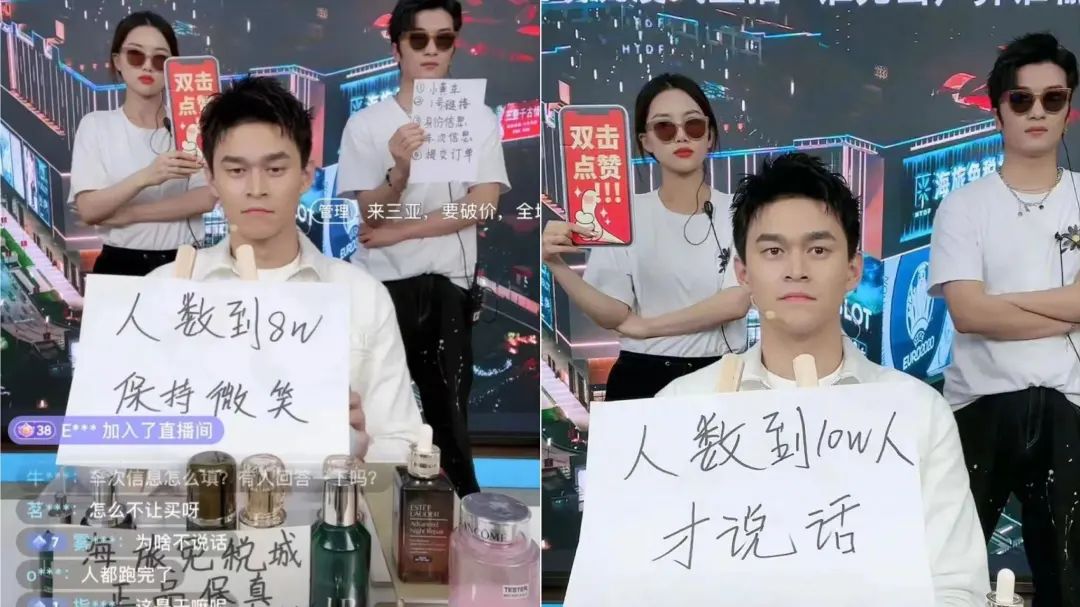 为了获取更多流量曝光,孙杨甚至在去年2月28日挑战了沉浸式直播。直播间里的孙杨带着墨镜抿紧嘴唇,身后还有两位戴着墨镜抱胸站立的助播,背景打上了“谁先出声算谁输”的标语,镜头前的白板不断更换着互动的附加条件:“人数到3万,就摘墨镜”“人数到5万,笑一下”“人数到8万,保持微笑”“人数到10万,才说话”。