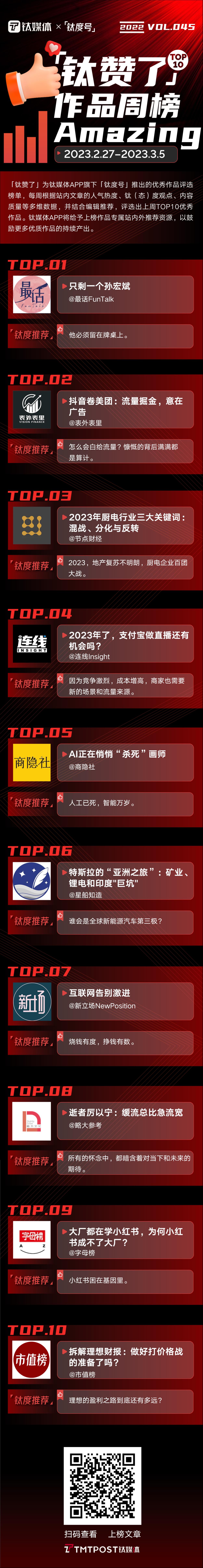 2023年2月27日—2023年3月5日,「钛赞了」榜单第45期上榜作品为: