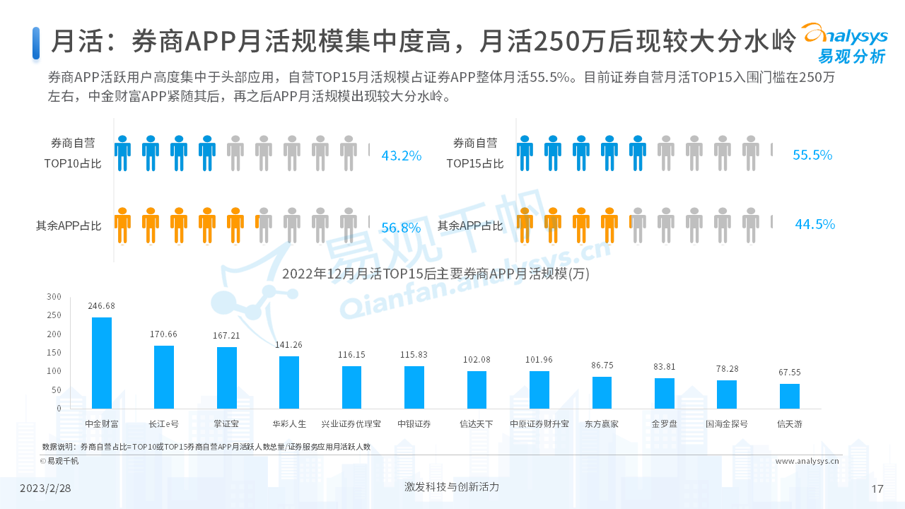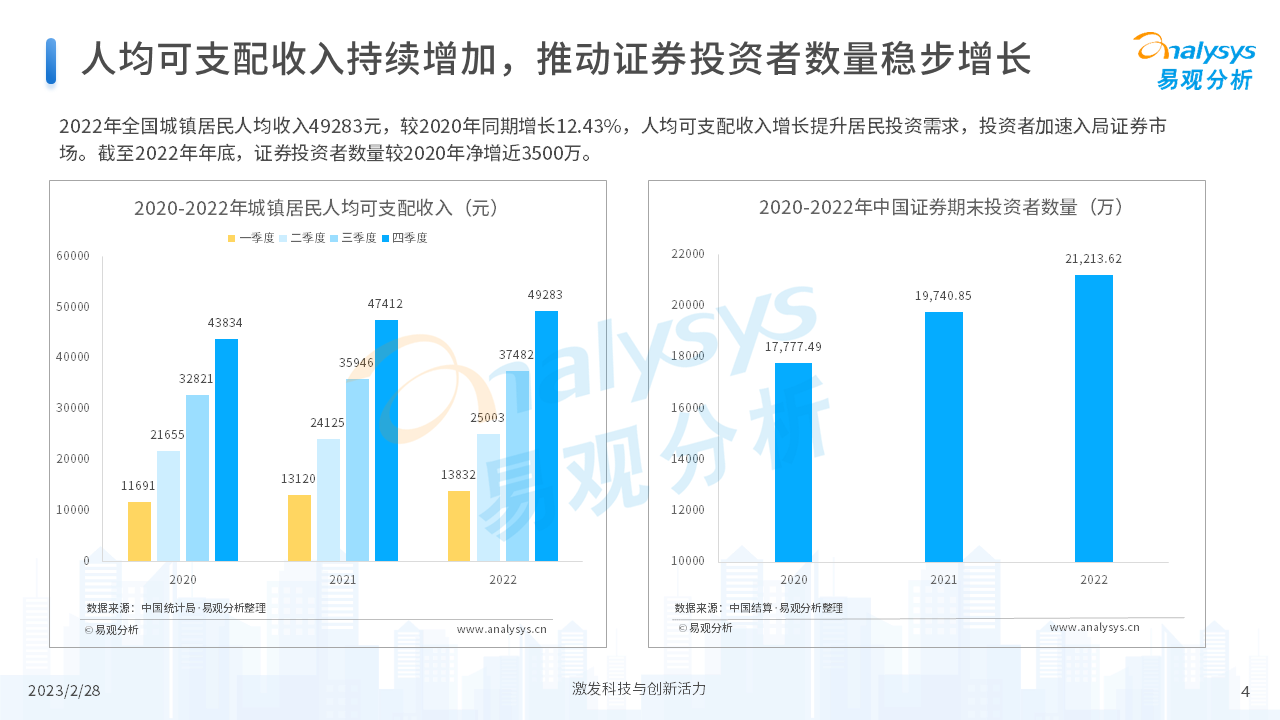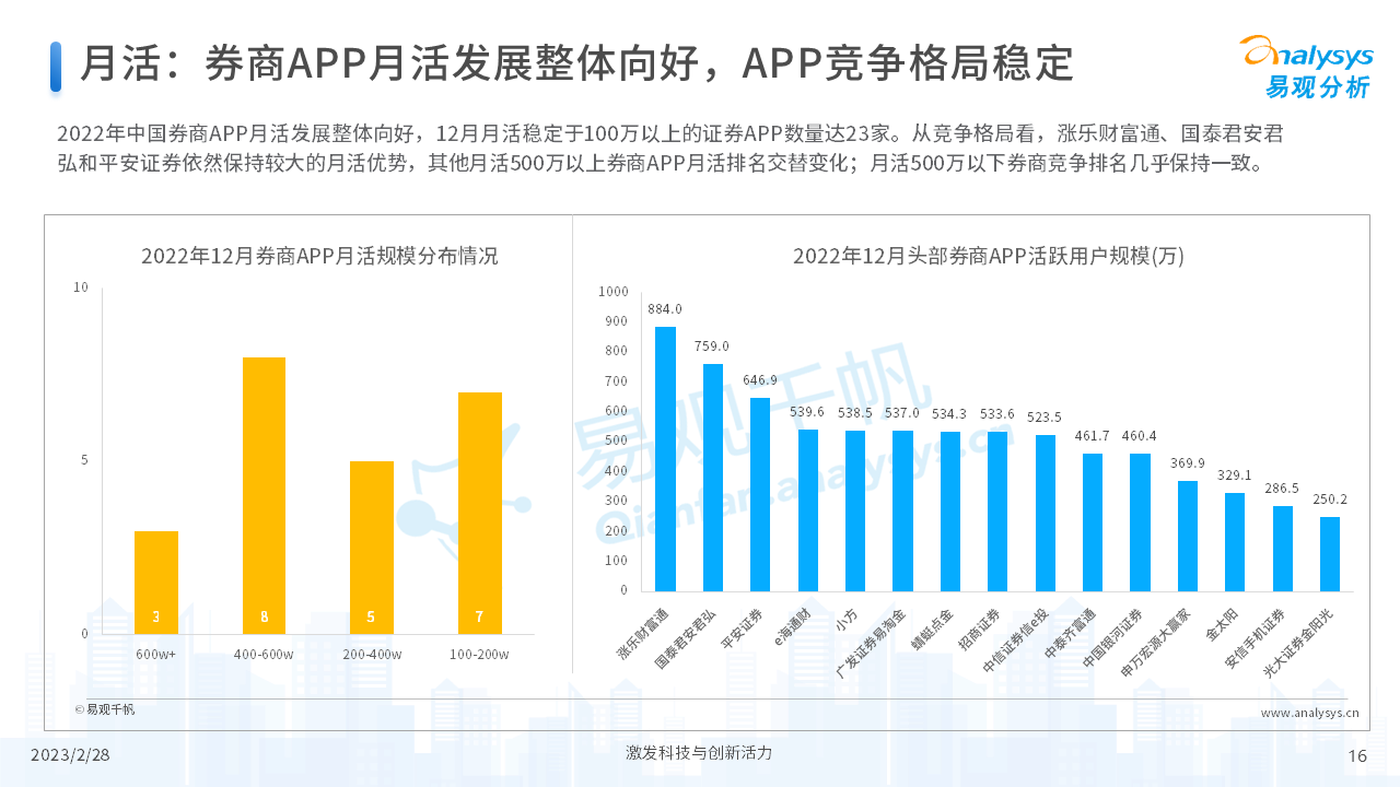 2022年全球金融市场动荡局面并未减慢中国证券市场扩容的脚步,中国证券投资者数量稳步增长,2022年年底投资者数量达2.12亿人。受此利好,中国证券APP应用市场平均月度活跃人数突破1.4亿。不过震荡行情背景下,证券APP月度活跃人数规模波动较大。