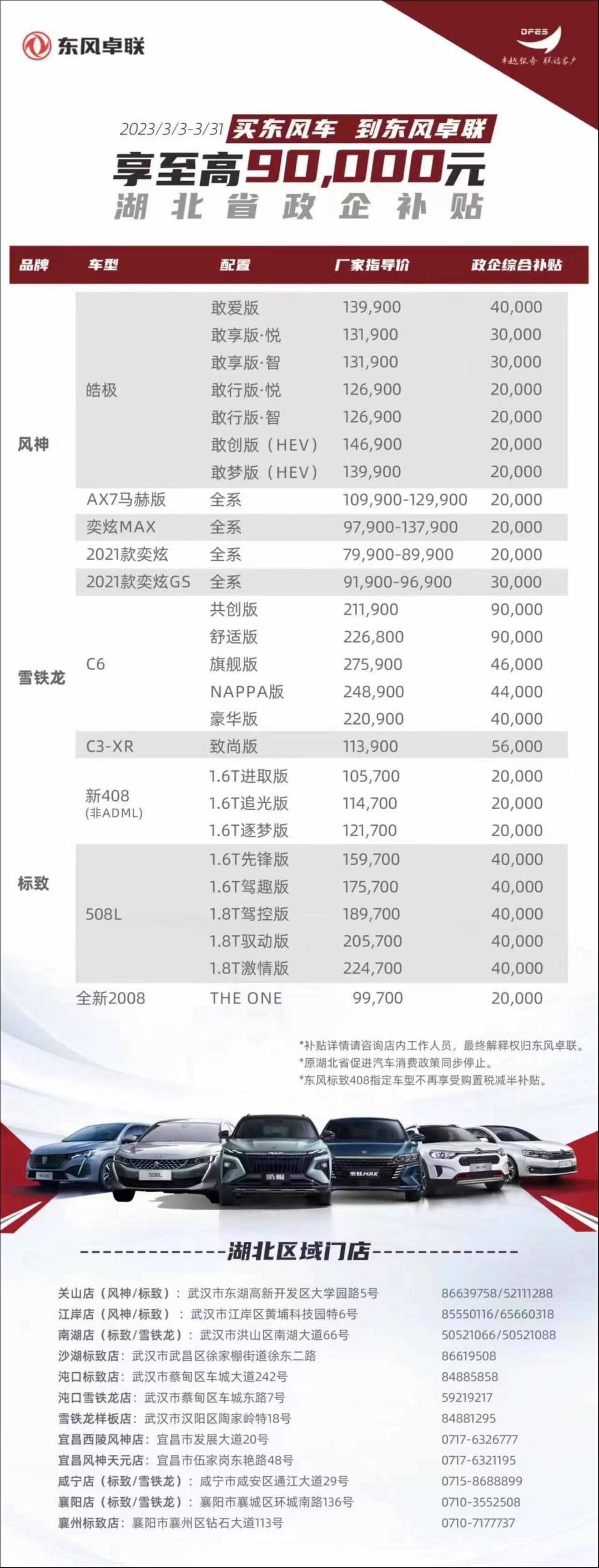 日前,钛媒体App从多方网络渠道获悉,湖北省联合东风汽车于日前推出史上最强购车季活动,本次购车活动主要有东风风神、东风标致、东风雪铁龙、东风本田等品牌。所涉产品涵盖皓极、标致408、雪铁龙C6、本田CR-V等上述品牌对应的主力车型,优惠金额从5000至90000元不等。