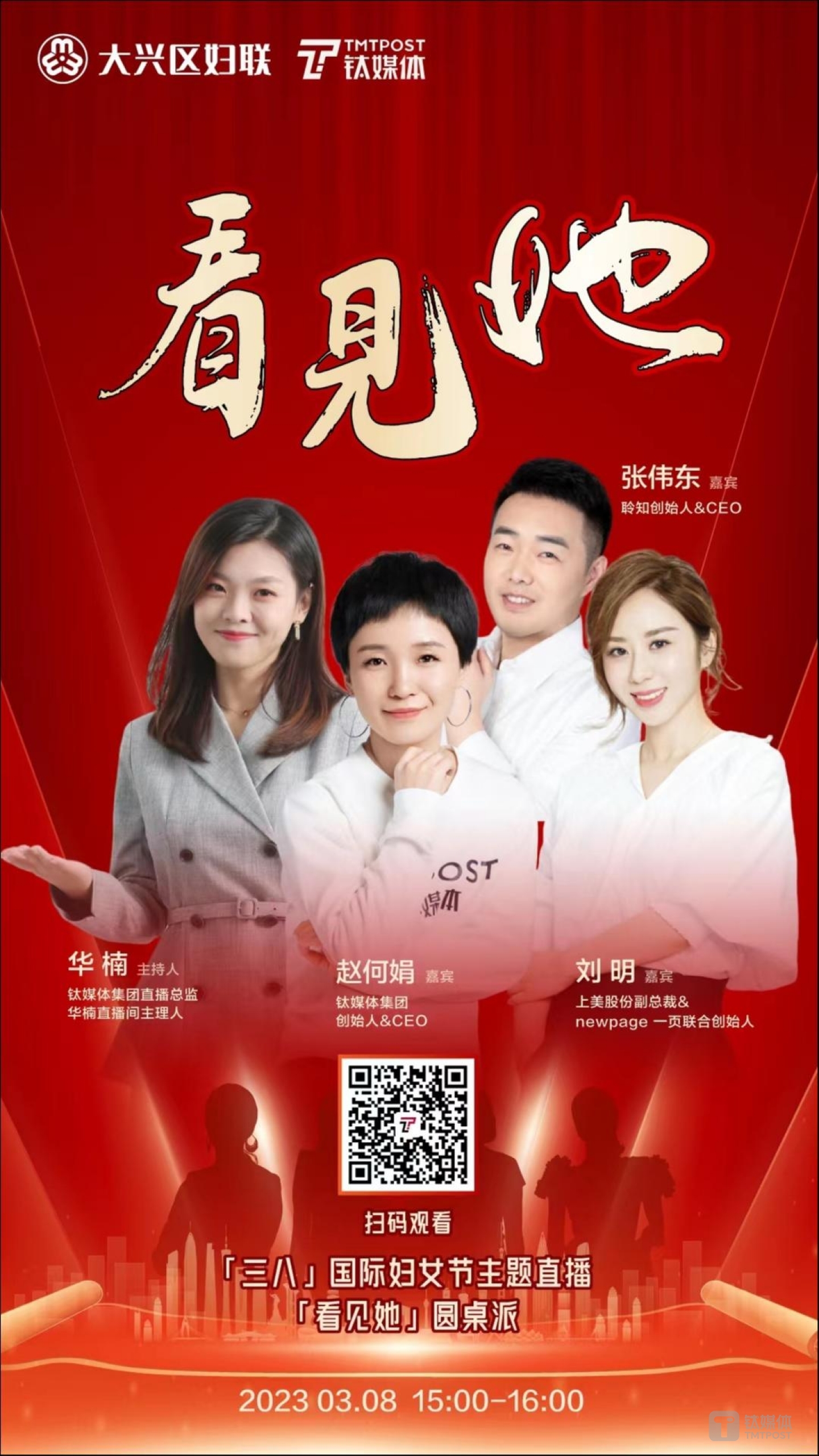 为庆祝“三八”国际妇女节,大兴区妇联联合大兴区多个部门和单位,共同举办了一系列“三八”国际妇女节庆祝活动,其中,在“看见·她”圆桌派活动中,钛媒体集团直播总监、华楠直播间主理人华楠,将对话钛媒体集团创始人、CEO赵何娟,上美股份副总裁&newpage 一页联合创始人刘明,聆知创始人&CEO张伟东,分享女性创业面临的挑战、如何看待“她经济”发展浪潮、如何平衡事业和家庭、以及家庭分工与子女教育的建议等话题。