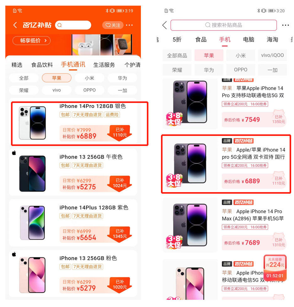 以最受关注的手机为例,在算上补贴后,各大主流手机品牌在拼多多、京东两个平台的售价并无明显差异。以iPhone 14 Pro 128G国行版为例,两个平台的补贴力度都是1110元,补贴后售价都为6889元。iPhone其他机型补贴力度的也大多在1100-1300之间,两大平台没有谁敢打出“全网最低价”之类的宣传口号。
