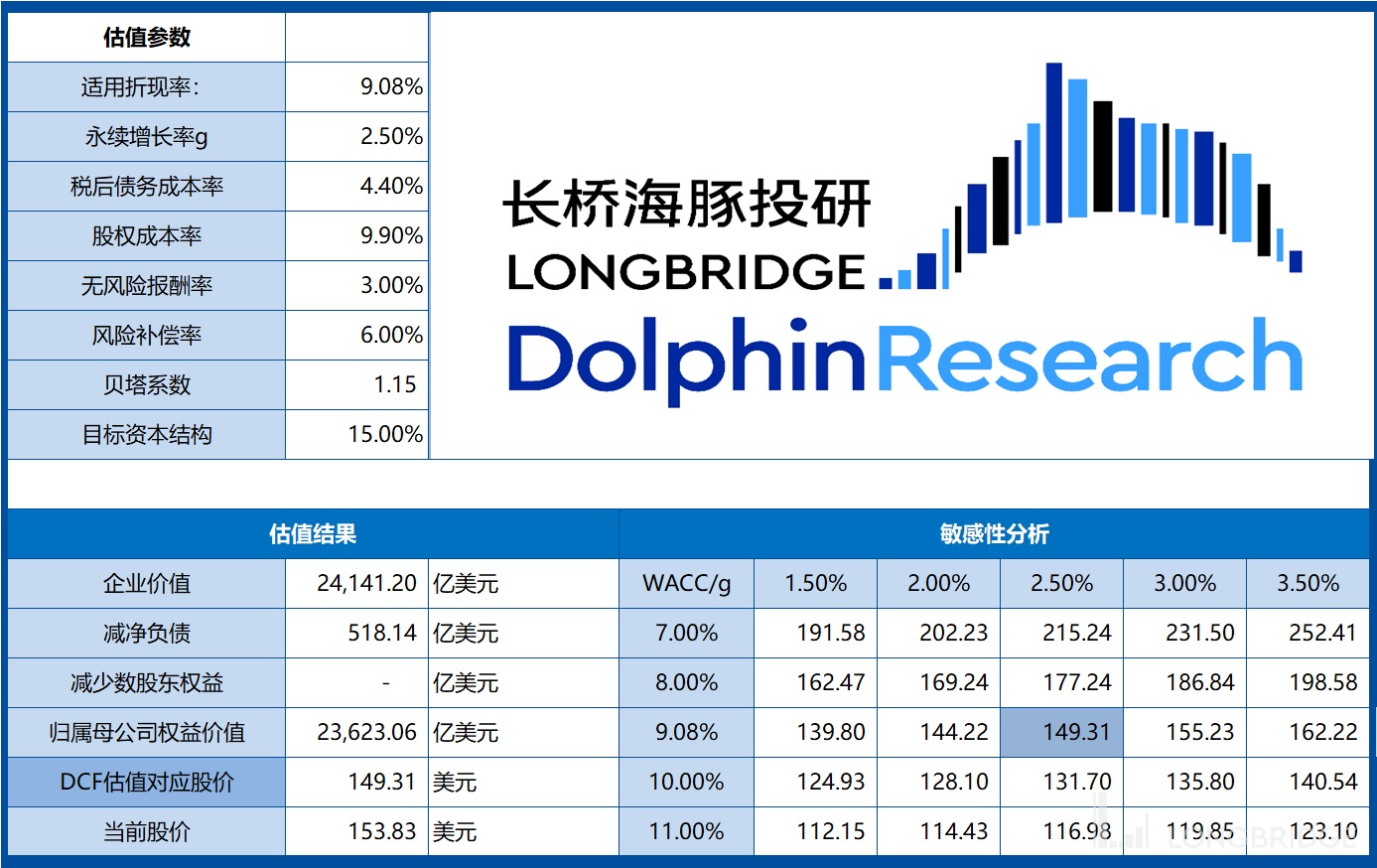 当前情况下,海豚君将 DCF 估值无风险利率下调至 3%(对应 WACC 为 9.08%),则对应公司 DCF 估值为 2.36 万亿美元(对应 149 美元/股),和当前股价(154 美元)相比无明显空间。没有新单品的续力,苹果公司业绩难以实现飞跃,只能是稳健的分红股。