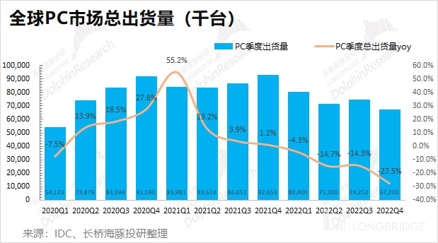 ②PC 市场:2022 年四季度全球 PC 出货量下探至 7000 万台以下,同比跌幅扩大至 27.5%。在疫情影响下,PC 受益于居家经济和办公的带动。而本季度回落至 6000 多万台的季度出货量,全球 PC 出货情况已经回落到了疫情前的正常水平,再进一步下探的风险不大。