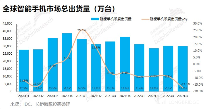 ①手机市场:2022 年四季度全球智能手机出货量勉强达到 3 亿台,同比下滑 17.1%,手机市场的跌幅继续扩大。四季度原本是手机销售的传统旺季,而在上季度因为中国区疫情问题并未如期迎来,跌幅反而进一步拉大。