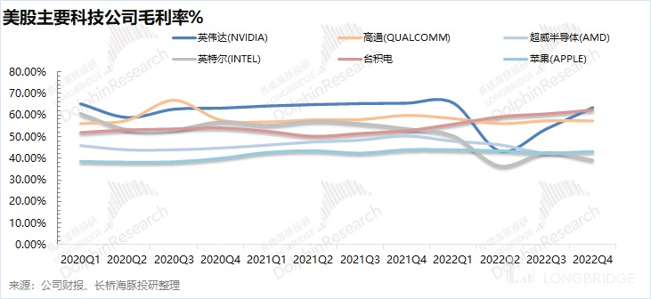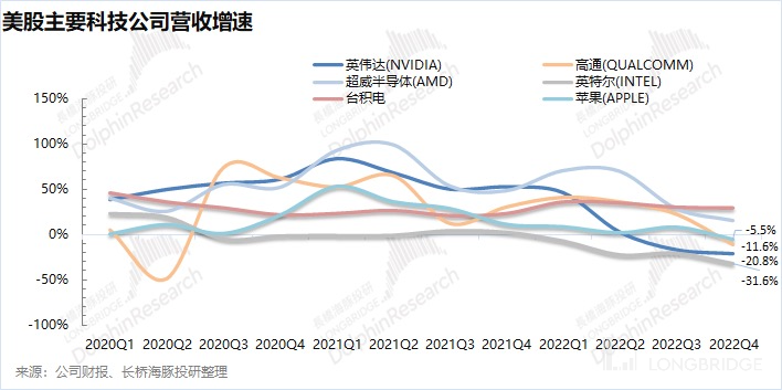 而下游的砍单也直接影响了半导体公司的收入情况,英伟达、$高通.US 和$英特尔.US 的营收都出现了双位数的下滑。在核心科技公司中,仅有 AMD 和$台积电.US 仍有同比增长,其中 AMD 主要受益于去年一季度收购的赛灵思,属体外增长;而台积电位于产业链的最上游,砍单的拖累还未传达到,但之后的季度风险就会逐步变大。