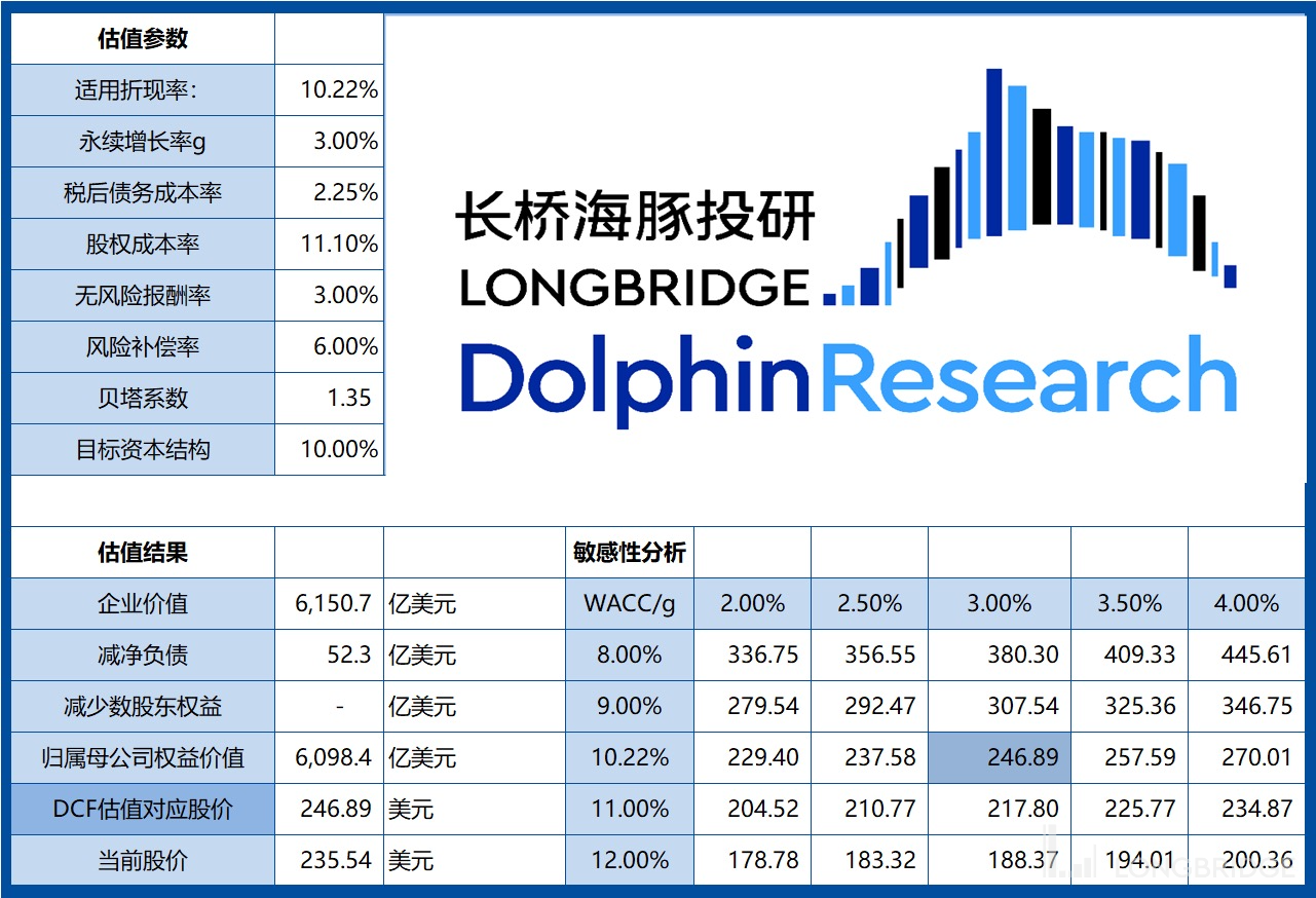 当前情况下,海豚君将 DCF 估值无风险利率下调至 3%(对应 WACC 为 10.22%),则对应公司 DCF 估值为 6098 亿美元(对应 247 美元/股),和当前股价(235.54 美元)仅有 5% 的空间。英伟达进一步打开向上的空间,仍需要在业务进展上有更大的突破。