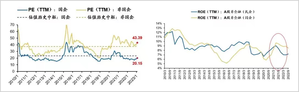 广发证券的统计数据显示,自2018年以来,特别是2021年之后,国企盈利能力已显著高于民企。与之相悖的是,国企的估值水平依然远低于民企(不到一半)。