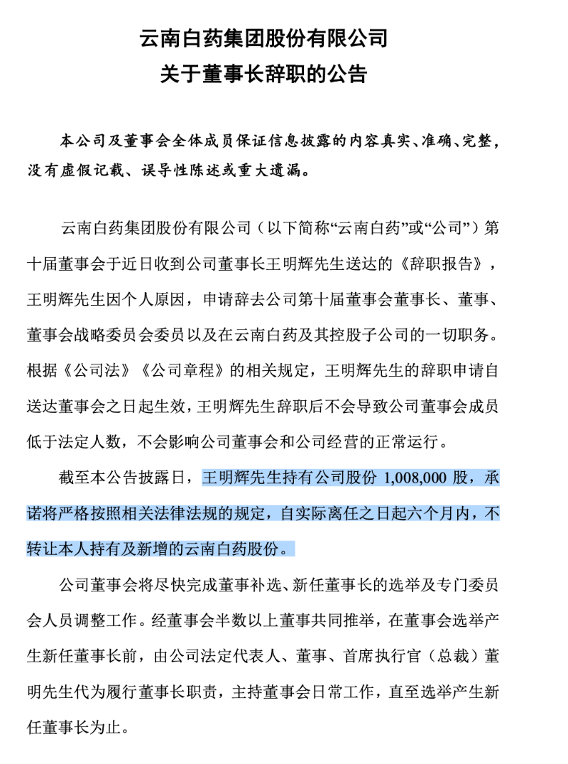 3月6日,云南白药发布公告,称王明辉因个人原因,申请辞去公司第十届董事会董事长、董事、董事会战略委员会委员,以及在云南白药及其控股子公司的一切职务。此时距离王明辉上任董事长,不过仅4个月。