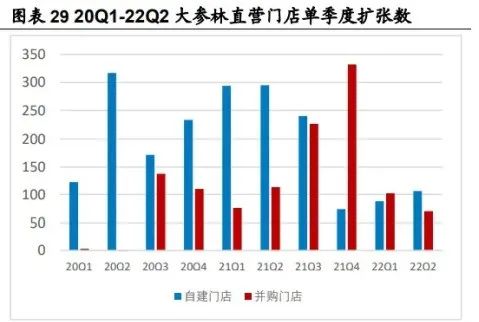 自建门店方面,由于大参林在多年的经营中,积累了深厚的直营门店拓展经验和选址数据,选择了根据不同商圈的特点,布局了如社区店、参茸旗舰店、O2O 店和院边店等不同店型店态。2022 年上半年,其新增自建门店就有194 家。