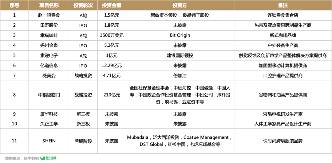 值得关注的是,本月有一笔超高额融资事件:我国最大的粮油企业「中粮福临门」完成210亿元战略融资,融资方包括全国社保基金理事会,中远海控,中国诚通,中国人寿,中国政企合作投资基金管理,中投公司,厚朴投资,淡马锡,亚赋资本等,是近年来我国食品行业最大的私募股权融资项目。此次引战后,中粮集团股比约70%。