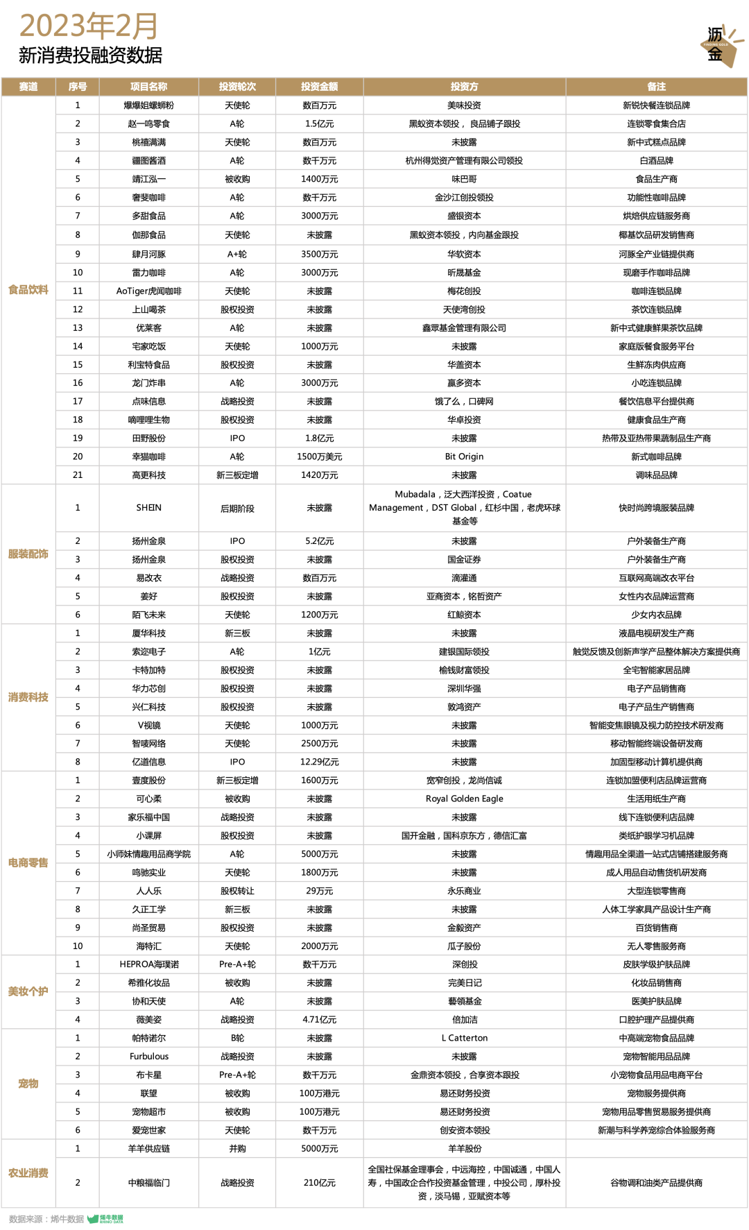 其中天使轮及种子轮融资事件达11起,A轮(含Pre-A及A+轮)融资达14起,占比43.86%,早期轮次所占比例经1月短暂下降后,再度恢复至往月平均水平,主要集中在食品饮料领域。