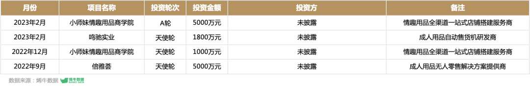 2月,情趣用品全渠道一站式店铺搭建服务商「小师妹情趣用品商学院」完成了5000万元A轮融资,而其上一轮1000万元天使轮融资仅发生在两月之前。企业主打成人情趣无人售货店、实体连锁店、美团、拼多多、淘宝等全渠道一站式店铺搭建以及运营服务。