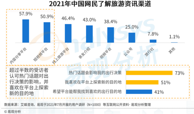 和小唐有相同想法的不在少数,根据艾媒咨询、易观分析等机构调研数据,2021年中国网民了解旅游资讯的渠道主要集中于内容分享平台、短视频平台,即小红书、微博、知乎,以及抖音、快手等。
