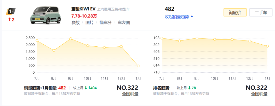 不过,从去年9月开启上市截止去年底,2023款宝骏KiWi EV整体销量直线下滑: