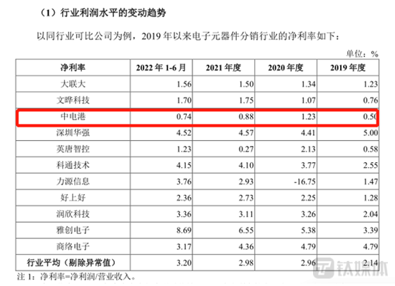 虽然中电港的业绩在持续增长,但中电港的净利率在行业中却是最低。报告期内,中电港的净利率分别为0.5%、1.23%、0.88%、0.74%,行业均值分别为2.14%、2.96%、2.98%、3.2%,始终低于行业均值,且差距正在变大。