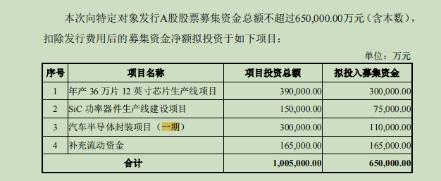 据士兰微披露的募集说明书显示,此次向特定对象发行A股股票募集资金总额不超过65亿元(含本数),扣除发行费用后的募集资金净额拟投资于年产36万片12英寸芯片生产线项目、SiC功率器件生产线建设项目、汽车半导体封装项目(一期)以及补充流动资金。前述四个项目分别拟投入募集资金数额为30亿元、7.5亿元、11亿元以及16.5亿元。