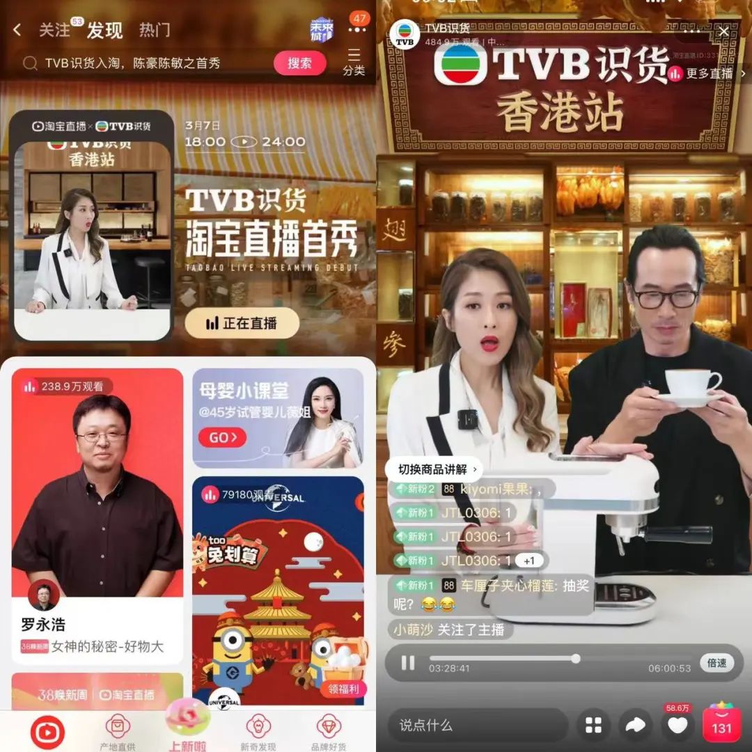 3月7日晚,TVB老戏骨陈豪和当家花旦陈敏之打头阵,靠粤语带货,在淘宝直播首秀拿下了开门红。截至次日零点,“TVB识货”的直播销售额突破2350万元,最高同时在线人数超3万,累计观看人次超过485万。
