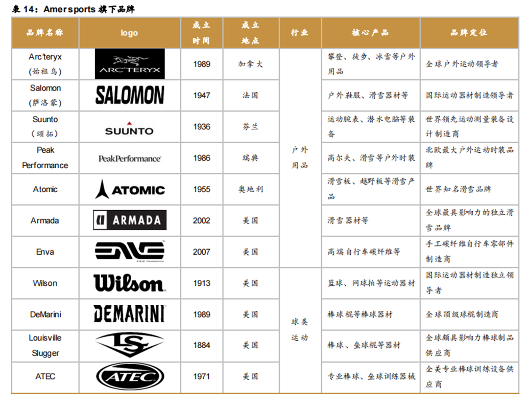 据悉,标的方是一家来自芬兰的,定位中高端的体育用品公司,旗下品牌包括法国的萨洛蒙、加拿大的始祖鸟、美国的威尔胜、瑞士的壁克峰等,涵盖户外装备、山地越野、网球、滑雪等运动场景,且在各自所属领域皆处于领先地位,具有较高的业内知名度。