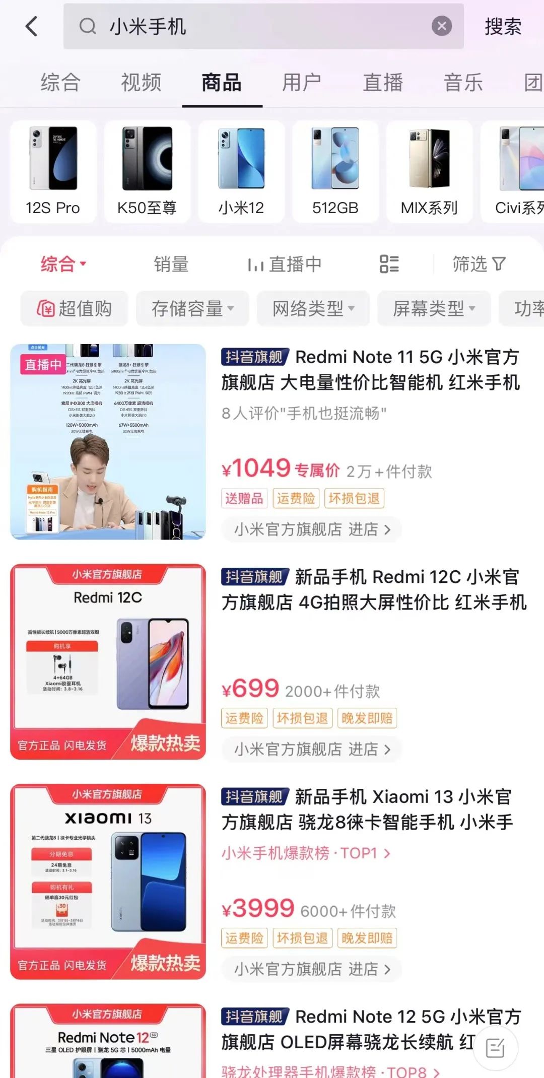 例如,在抖音搜索“小米手机”,结果页除了展现各类评测和资讯内容外,还会在搜索框下方的醒目位置设置“商品”入口,点击即可查看小米手机的不同型号,并跳转购买。