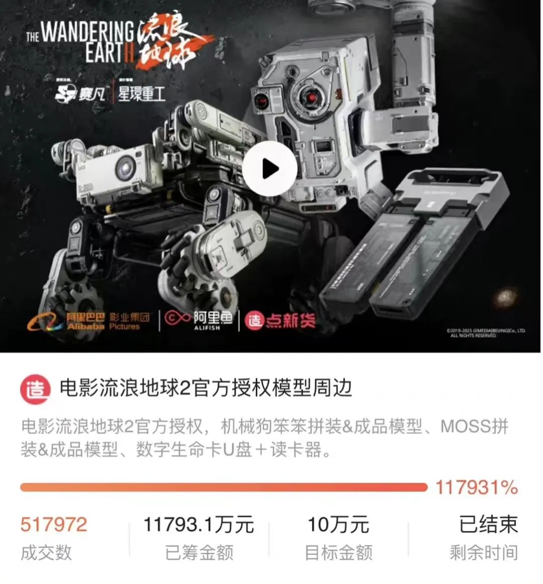 一月底,《流浪地球2》官方授权模型周边众筹落幕时,完成率达117931%。影片将众筹目标定在10万,如今来看显然保守了,但若走出结果论,就会发现这一目标设置是有其合理性的。