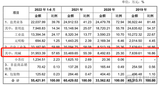 可见,纯碱始终都是江盐集团创收最多的产品。与此同时,报告期内江盐集团纯碱实现的毛利分别为7639.61万元、8492.82万元、33469.65万元、31953.39万元,分别占当期毛利总额的16.86%、25.3%、55.39%、57.65,也就是说,自2021年起,纯碱也成为了江盐集团创利最多的产品。