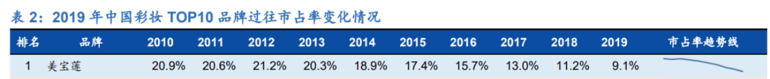 即便是一直以来高居榜首的美宝莲,市场占有率也是呈连续下降态势。