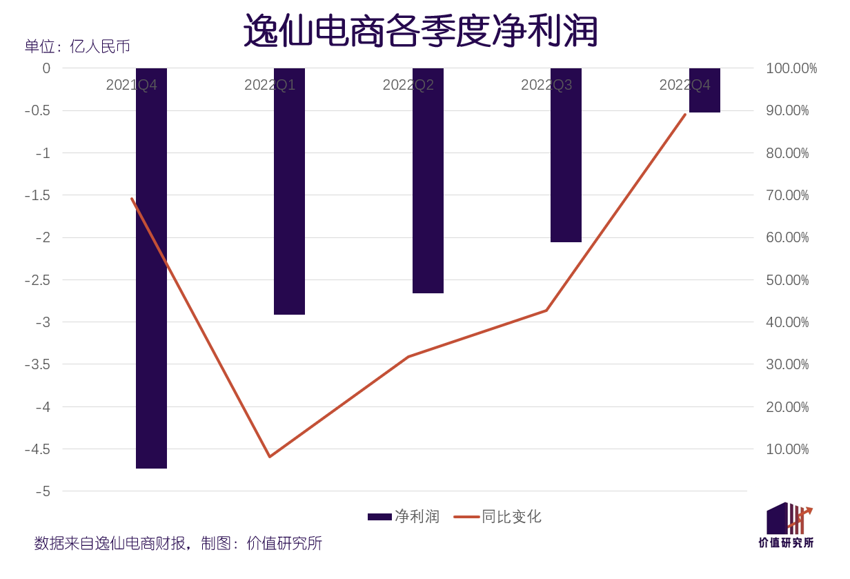从增长曲线来看,逸仙电商的颓势已经持续了很长一段时间:截止去年四季度,其营收录得同比五连跌,2021年四季度至2022年三季度的同比跌幅分别为22.12%、38.3%、37.57%和36.11%。虽然四季度跌幅略有收窄,和巅峰时期比还是有很大差距。
