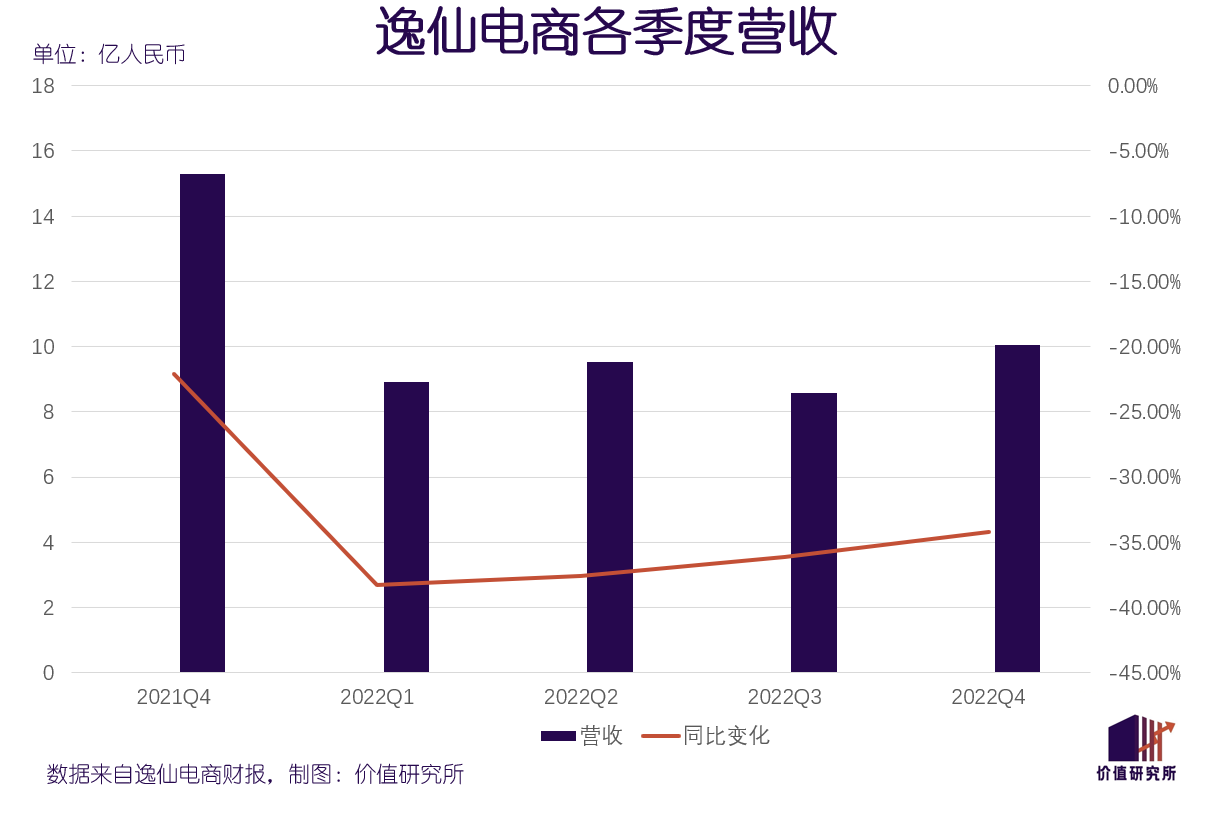 翻看逸仙电商的财报,最大问题是营收持续下滑。数据显示,逸仙电商四季度总营收为10.05亿元,同比下跌34.23%;2022财年营收则录得37.06亿元,同比下跌36.54%。