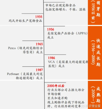 中国宠物产业比发达国家起步晚,落后美国20年以上。1935年美国玛氏开始生产狗粮,1993年第一款狗粮才进入中国。1986年,美国最大的宠物连锁医院VCA成立,1998年,中国最早的宠物医院之一瑞鹏才在深圳成立。