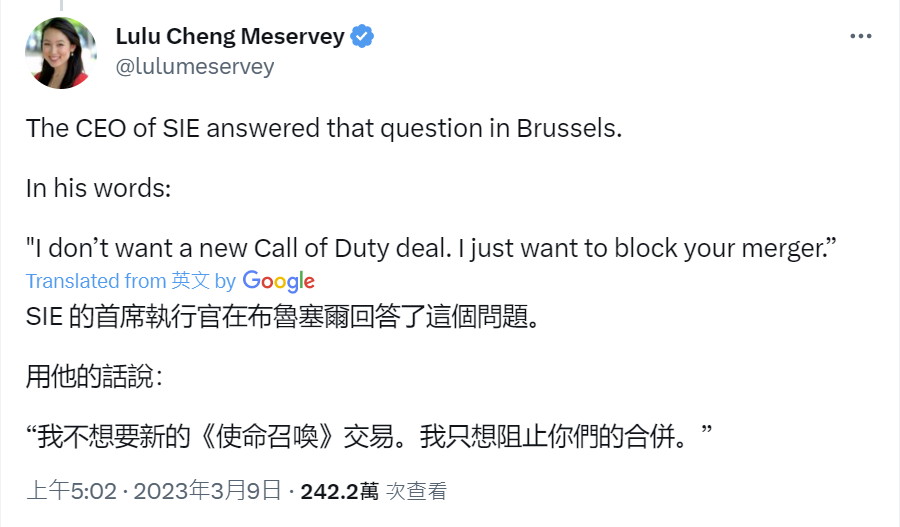 但索尼显然不领情,甚至也不是很关心《使命召唤》的去留问题。据动视暴雪高管 Lulu Cheng Meservey 透露,索尼互动娱乐 CEO 吉姆·瑞安在 2 月欧盟委员会监管机构举行的一次闭门听证会上说: