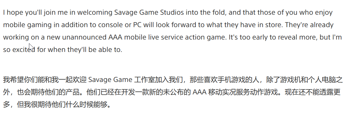 除此之外,EA、育碧也都在发力手游化,甚至包括索尼去年 8 月收购 Savage Game Studio 后也在新闻稿中透露,他们正在开发一款 3A 级持续运营动作手游,很难不让人联想到米哈游的《原神》。