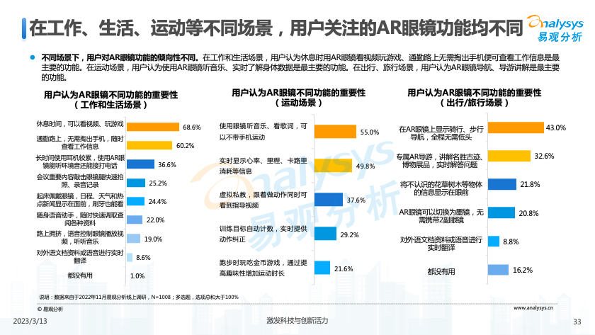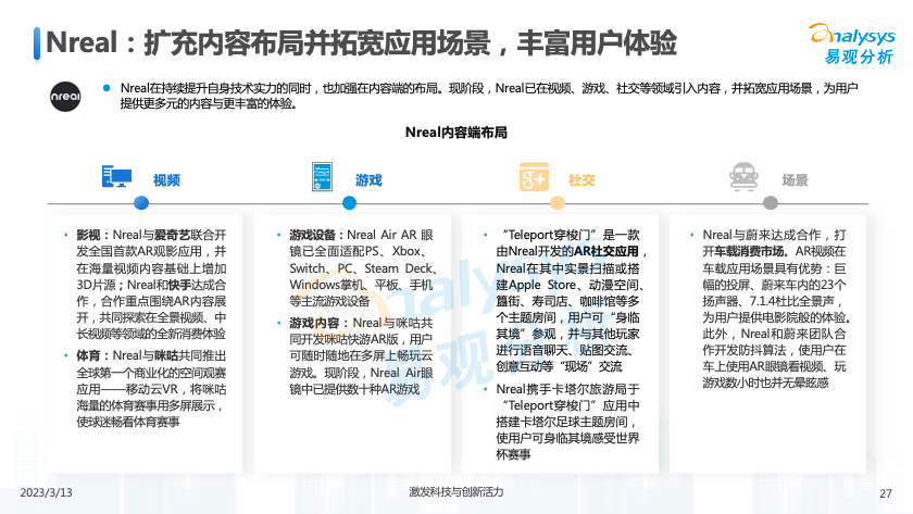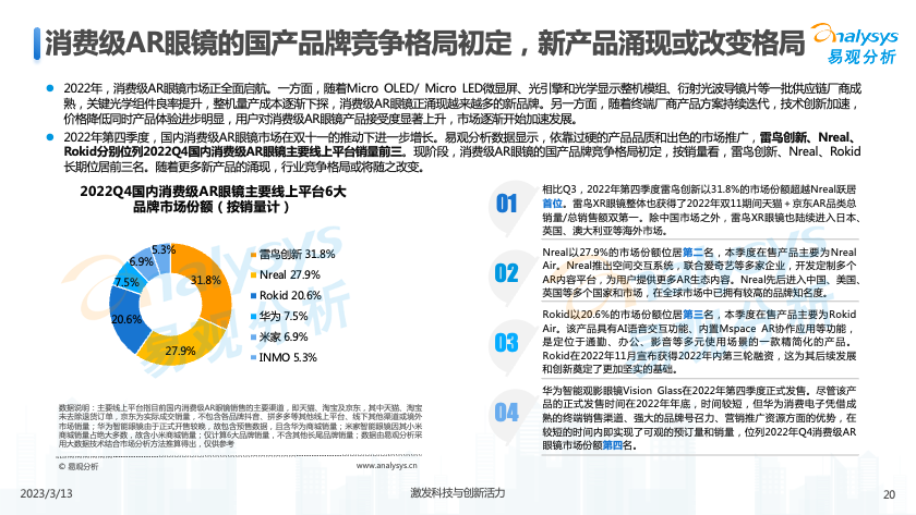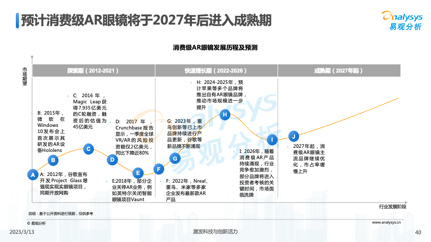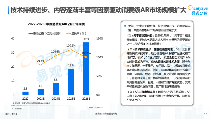 图片来源@视觉中国文|易观随着消费级AR眼镜相关技术的进步,整机量产成本逐步下探,同时产品的体验持续进步,用户对消费级AR眼镜产品接受度上升,消费级AR眼镜市场逐步进入快速发展阶段。依靠过硬的产品品质和出色的市场推广,国产消费级AR眼镜品牌占据国内主流市场。