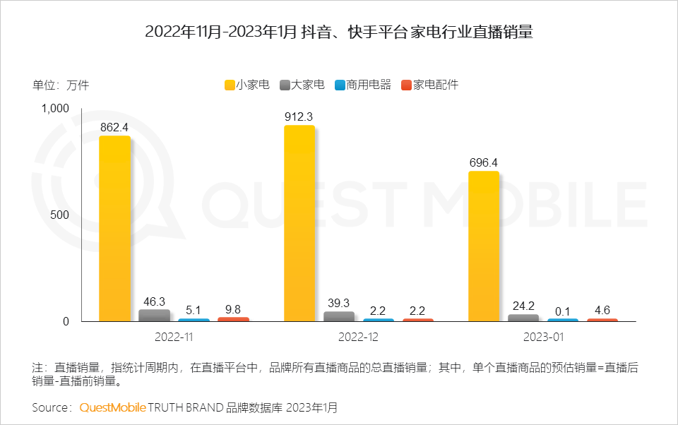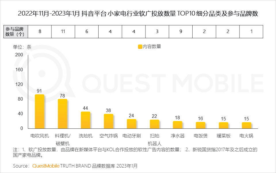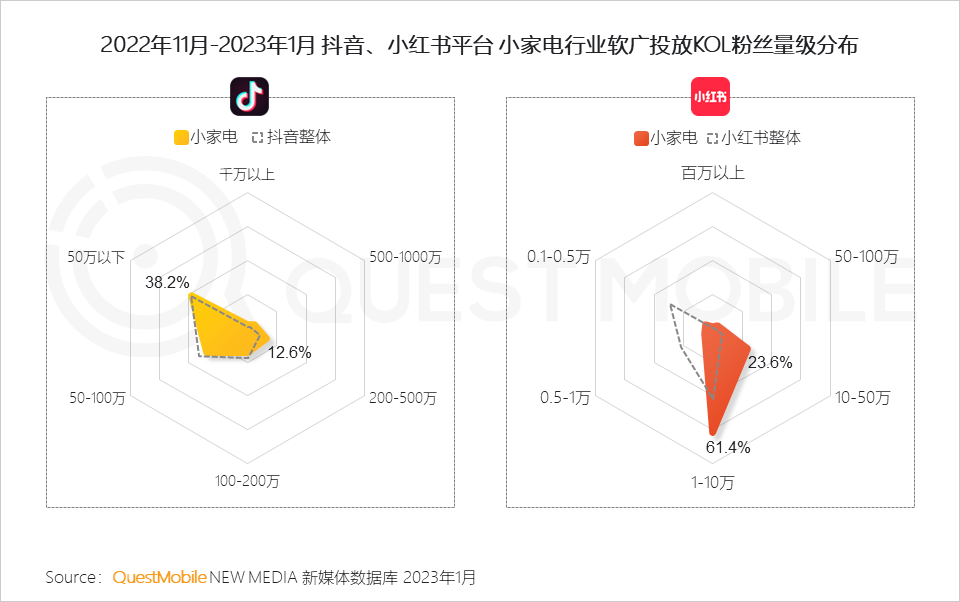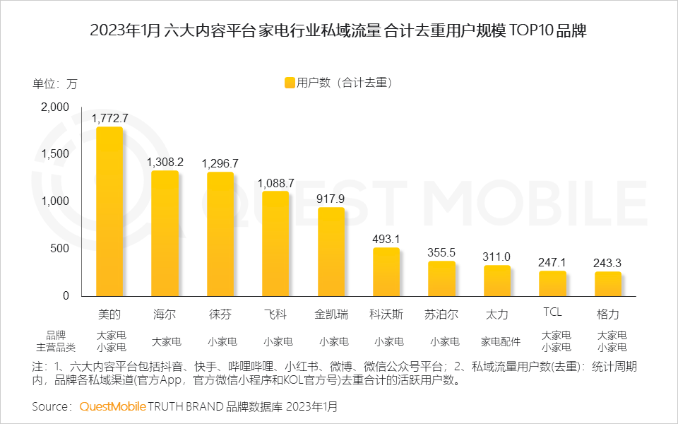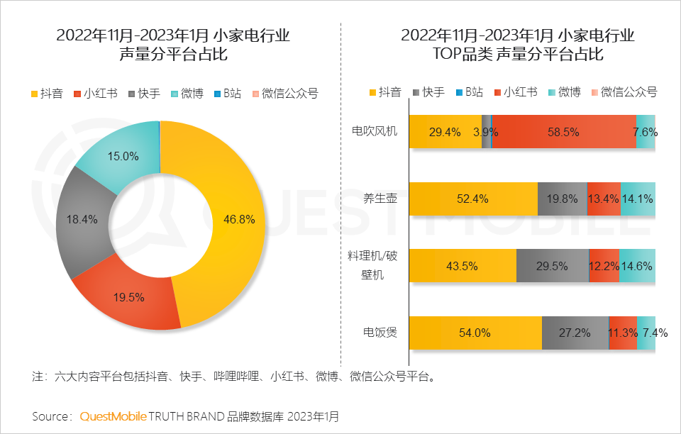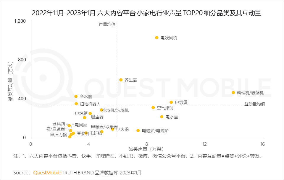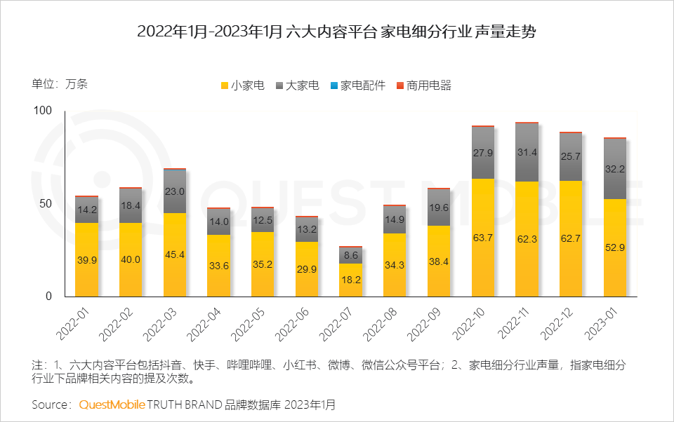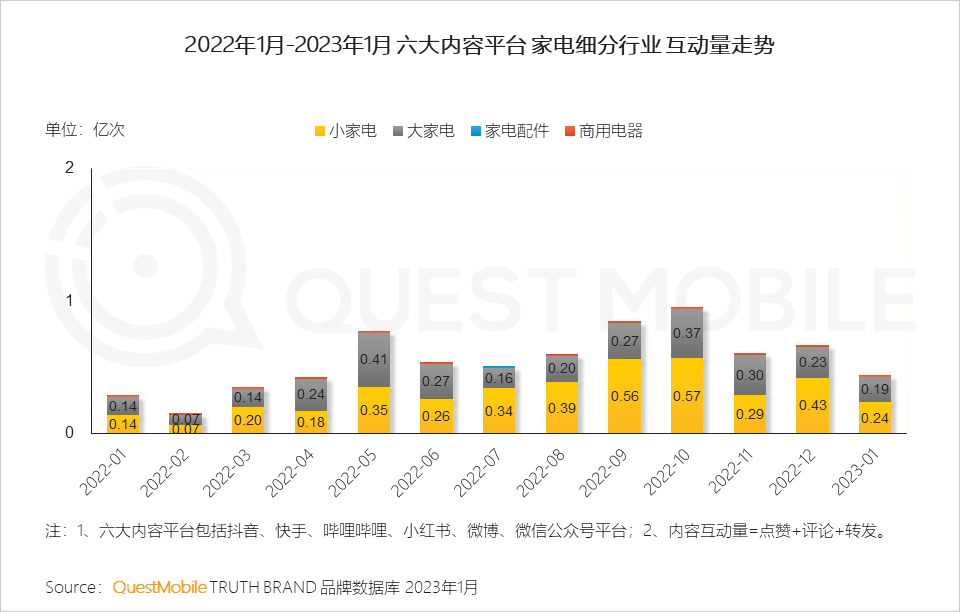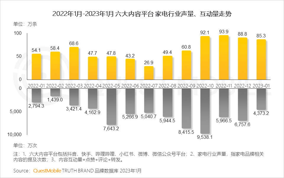 QuestMobile数据显示,2023年1月,家电行业内容声量同比增长57.7%,内容互动量同比增长56.5%。