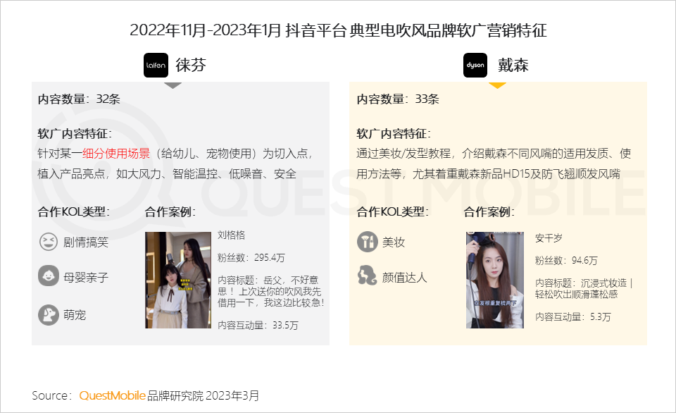 2、以热门品类-电吹风机为例,徕芬通过多种细分场景植入产品亮点,并结合“剧情需要”进行达人匹配;戴森则通过美妆/美发教程宣传其产品功能和使用方法