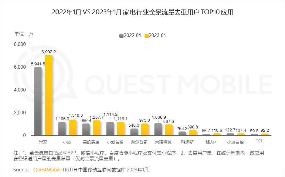 1、随着智能家居的发展与“懒宅经济”的催化,套系化、智能化的家装方案成为年轻人追捧的新潮流;2023年1月,家电行业相关应用的用户流量同比增长显著