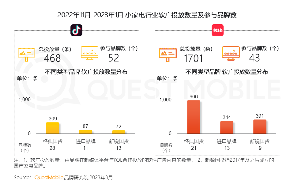 2、从小家电品牌在2个主要平台的软广投放来看,小红书内的投放量是抖音的3倍,与其深度种草的平台属性息息相关