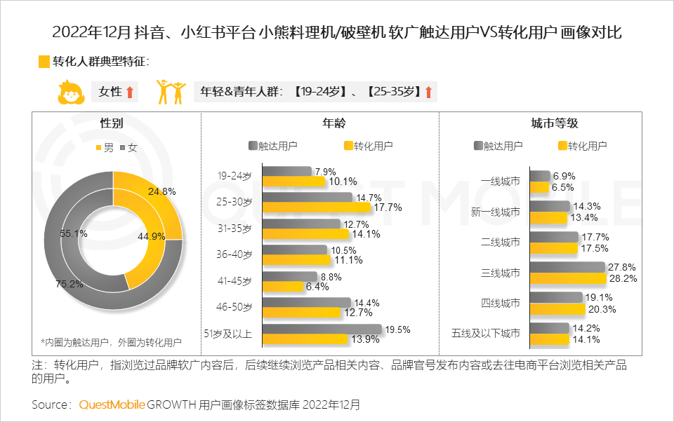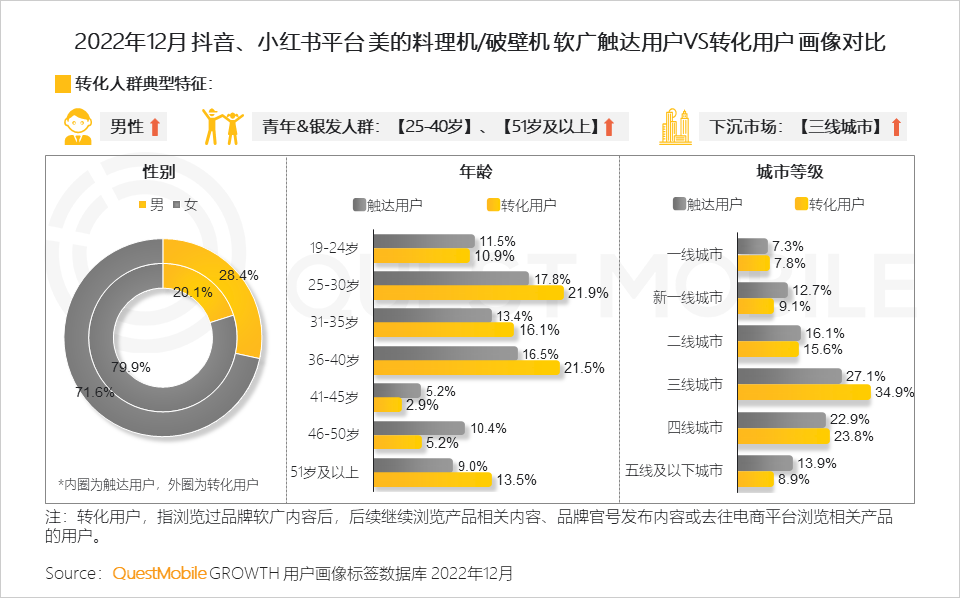 13、与小熊不同的是,美的破壁机内容带动了银发人群的转化,此外,也在男性、三线城市用户中带动行为转化,也与其后续内容关注度高但电商转化低有一定联系