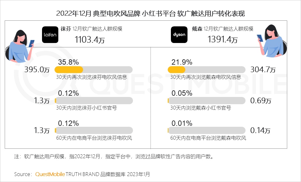 5、徕芬的电商转化效果在小红书平台更为突出,背后与平台深度种草属性和主打性价比的内容策略相关;值得注意的是,虽然戴森在触达用户规模上表现突出,但后续“转化成绩”平平
