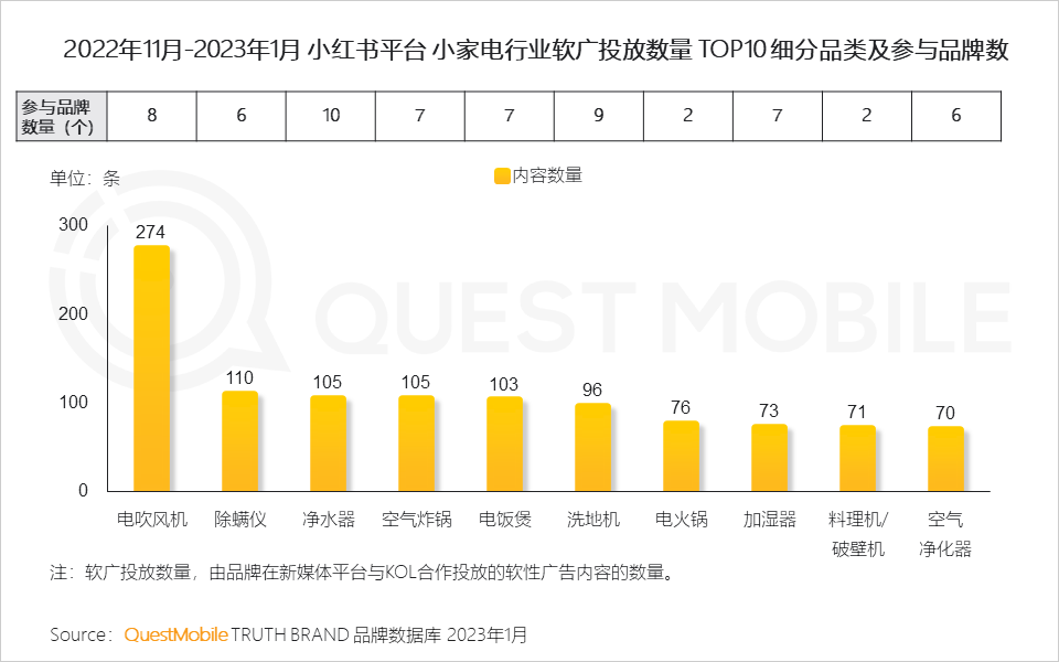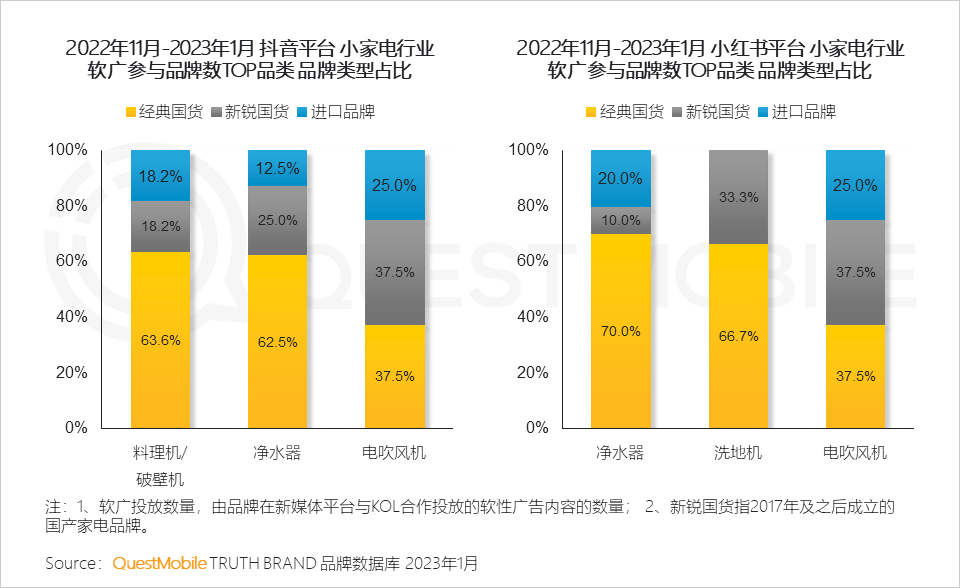QuestMobile数据显示,电吹风机品类下,参与软广投放的品牌中,新锐国货品牌数量占比37.5%、进口品牌数量占比25.0%。