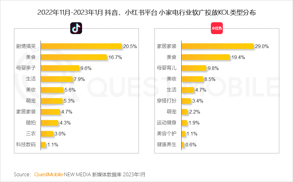 抖音站内,小家电品牌与剧情搞笑类KOL合作最多,这与平台“泛娱乐”属性相关;小红书平台,则与家居家装类KOL合作最多,通过家居家装类达人,以深化使用场景的方式,将产品卖点与精致、美好的生活方式相连接。