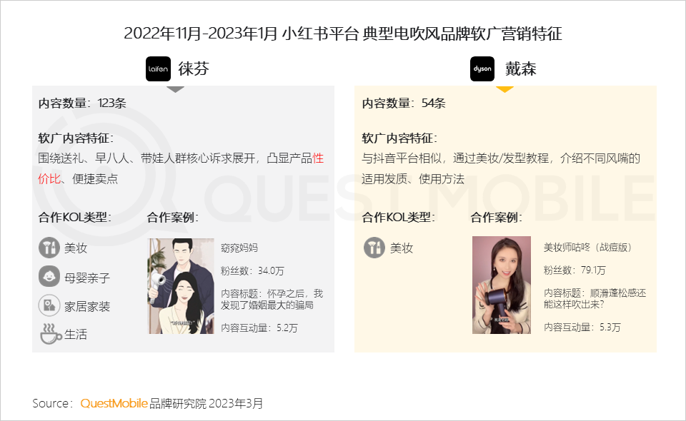 3、小红书平台中,徕芬则聚焦宝妈、早八人及送礼人群,将“笔墨”围绕便捷和性价比展开;戴森的内容则与其在抖音内“路线”保持一致,KOL的选择也较为单一